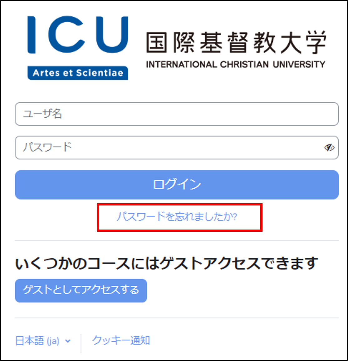 1. Moodleのトップ画面から「パスワードを忘れましたか?」をクリック